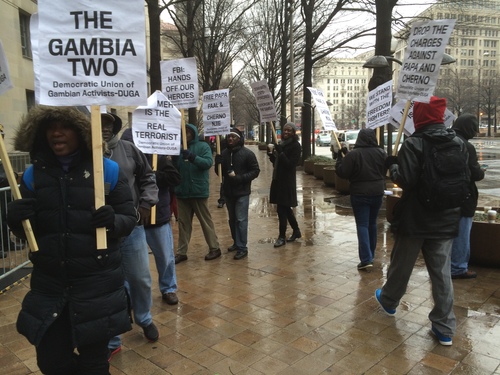 A group of Gambian protestors led by the Democratic Union of Gambian Activists (DUGA) gathered outside the Department of Justice on Jan. 26 to demand the release Gambian activists, Papa Faal and Cherno Njie. Faal and Njie—known as the Gambian Two—made news earlier this month for attempting to overthrow the Gambian dictator, Yahya Jammeh, and are currently being held in U.S. prisons due to their U.S. citizenship.