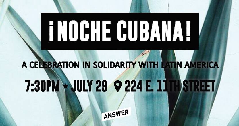 Mark your calendars for our annual Noche Cubana! Join the ANSWER Coalition in celebrating the continued resistance of Latin America against U.S. imperialism on July 29th at 224 E. 11th Street. Come and enjoy food, live music, dancing and an auction featuring exclusive items you won’t find anywhere else. Have a toast to the forward strides of socialism in Cuba, the defense of the Bolivarian Revolution in Venezuela, and the struggle for democracy in Brazil with your favorite anti-war organization. It’s bound to be an event you won’t want to miss! $10 suggested donation for entry, no one will be turned away for lack of funds.
